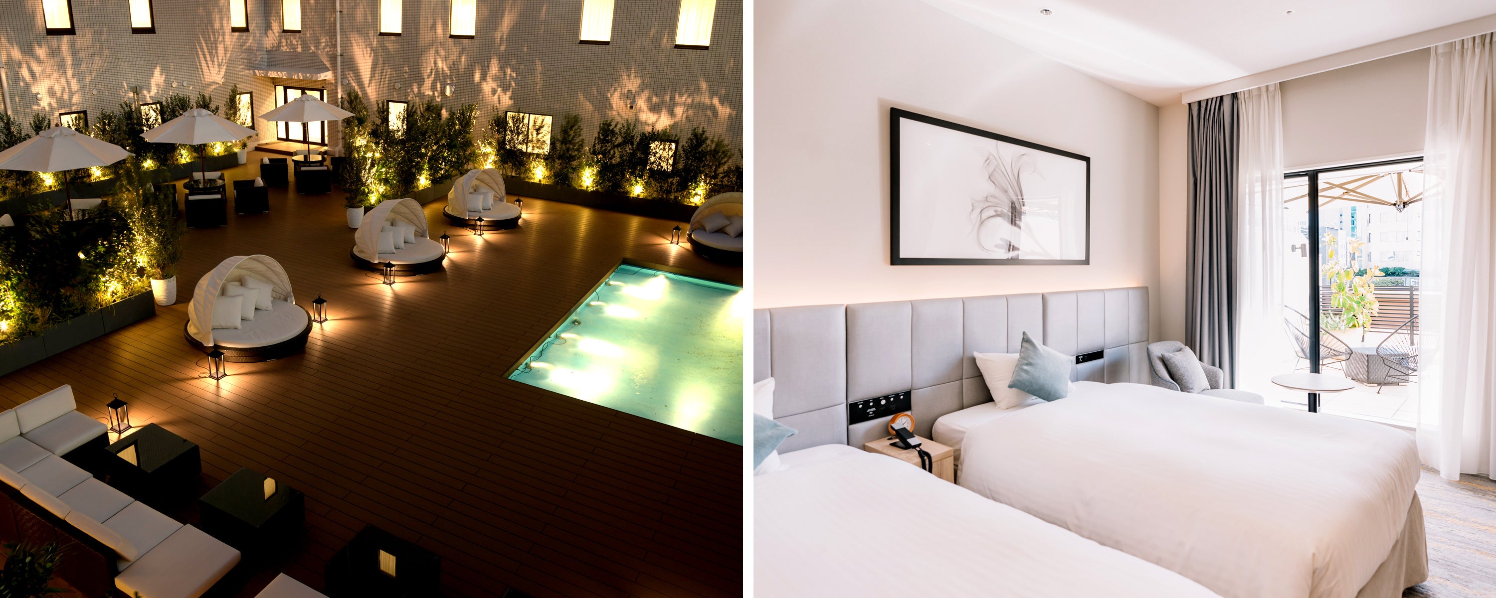 J R博多駅筑紫口から徒歩1分、福岡空港から地下鉄で5分、さらに地下鉄博多駅に直結。ナチュラルな素材感がアクセントとなる客室や宿泊ゲスト専用のエグゼクティブガーデンやジムなどを完備し、都会にいることをしばし忘れさせ、旅の活力を生み出します。