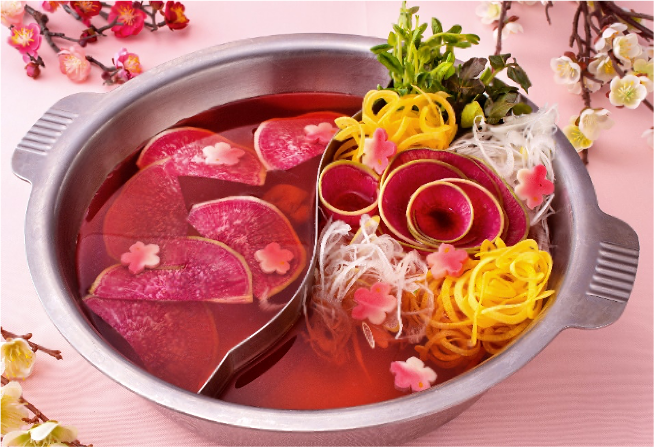 梅だしを火にかけると“紅芯大根”の色素が溶け出して時間とともにピンクが濃くなっていきます。そこに色鮮やかな旬野菜を入れたり梅の花に見立てた“おふ”を散らして、自分流にアレンジできるのがうれしいポイントです。華やかな鍋に思わず「かわいい!」とつぶやいてしまうこと間違いありません。