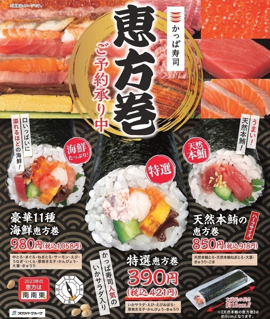 コロワイドグループのかっぱ寿司(カッパ・クリエイト㈱ 本社:神奈川県横浜市)は、2023年1月27日(金)~2月3日(金)の期間、かっぱ寿司全店にて『特選恵方巻』『豪華11種海鮮恵方巻』『天然本鮪の恵方巻』の3種類を販売いたします。