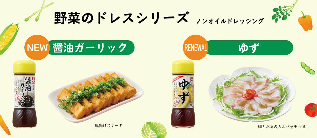『野菜のドレス』シリーズは多様化するサラダの食べ方に対応するため、シンプルなサラダも様々な食材を使った食べごたえのあるサラダも楽しめるノンオイルドレッシングのラインナップ展開を目指して開発しております。新商品『野菜のドレス醬油ガーリック200』は人気が高まっている「にんにく」に着目した、ノンオイルなのにコクと旨みのあるドレッシング、リニューアル商品『野菜のドレスゆず200』はより柚子の爽やかで瑞々しい果汁感が感じられるドレッシングです。