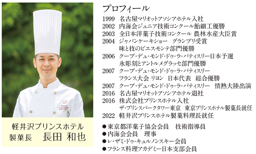 世界的なパティスリーのコンクール、クープ・デュ・モンド・ドゥ・ラ・パティスリーで日本代表として優勝した経歴を持つシェフ・パティシエ 長田和也 氏が、本キャンペーンのためにナガノシードルに合うスイーツセットを考案。シードルとスイーツの新たな出会いをお楽しみいただけます。