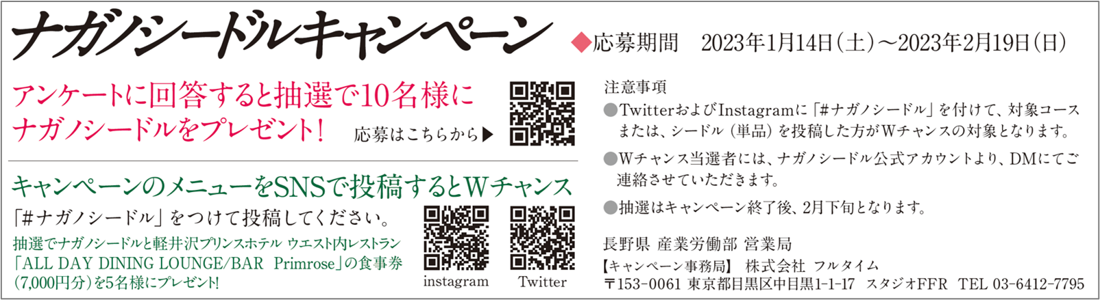 キャンペーン期間中に対象コースを召し上がった方およびシードルをご注文された方で、お食事の写真をSNSに投稿いただいた方の中から抽選で、ナガノシードルと軽井沢プリンスホテルウエスト内レストラン「ALL DAY DINING LOUNGE/BAR P r i m r o s e」のお食事券7,000円分を5名様にプレゼントいたします。