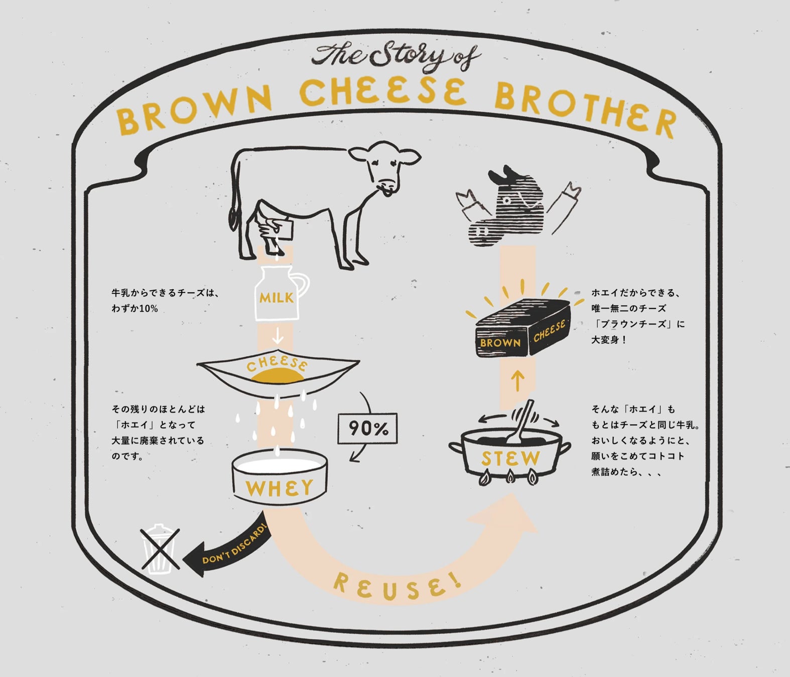 ノルウェー発祥のホエイを煮詰めてつくったチーズのこと。牛乳からチーズをつくる過程で大量に出るホエイ(約90%)を廃棄することなく、おいしく活用するために生まれました。砂糖不使用でありながらほんの少しだけ甘さを感じるユニークなチーズは、お菓子への加工もしやすく、長持ちすることも嬉しい特徴です。