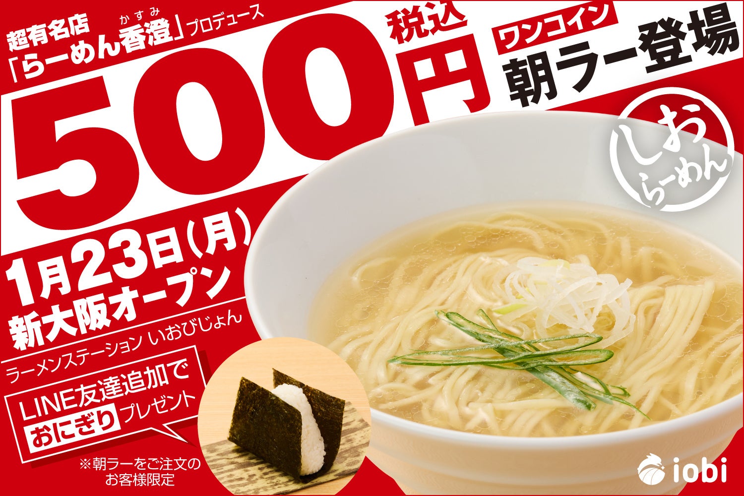 株式会社IOBI(イオビ、所在地:大阪府大阪市、代表取締役:石井 智大)は、「ラーメンステーション いおびじょん 新大阪」を本社1Fに2023年1月23日(月)にオープンします。早朝6時半から名店の朝らーめんをたったのワンコインで提供し、また11時から別の有名店の昼らーめんと時間によって有名らーめん店が入れ替わる、日本初のらーめん店です。オープンに伴い、1月20日(金)にメディア関係者向けの試食会・撮影会を開催いたします。今後は2カ月に一度のペースで、あっと驚く名店のらーめん店の味を入れ替えながら提供予定です。