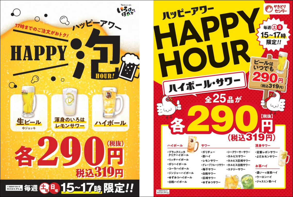 コロワイドグループの株式会社アトム(本社:神奈川県横浜市、代表取締役社長:山角豪)は居酒屋「いろはにほへと」、「やきとりセンター」の店舗で、2023年1月14日(土)からお得に特別プライスでドリンクが楽しめる土曜・日曜限定の「ハッピーアワー」を実施致します。