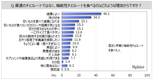 ■直近1年間に機能性チョコレート食べた人の理由は「健康によい」が約46%、「味が好き」が3割強、「甘いものを食べて健康になれる」が2割
