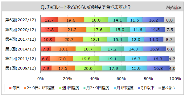 | <今 回>(2022/12)https://myel.myvoice.jp/products/detail.php?product_id=29302 ※上記設問の他に「好きなチョコレートのタイプ」「チョコレート購入時の重視点」も聞いています。 <第5回>(2020/12)https://myel.myvoice.jp/products/detail.php?product_id=26901 |