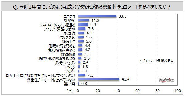 チョコレートを食べる人のうち、直近1年間に機能性チョコレートを食べた人は5割強です。食べた成分・効果は(複数回答)、「高カカオ」が38.5%、「乳酸菌」が11.3%、「GABA(γ-アミノ酪酸)」が9.9%です。