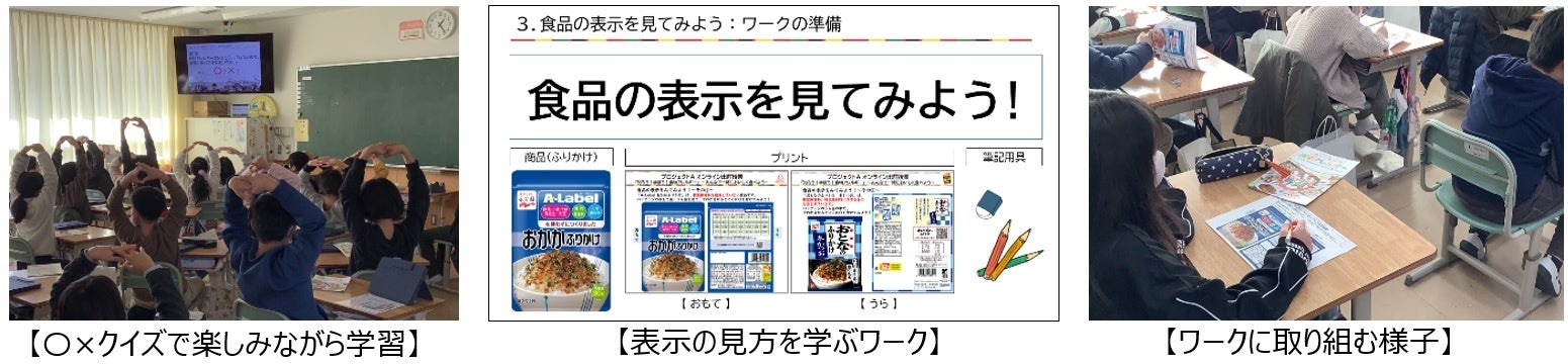 食物アレルギーに関するクイズや、実際に商品を手にしながら表示を見てもらうワークを実施しました。また、食物アレルギー配慮商品に取り組む企業として、普段見ることのできない製造の様子などを紹介しながら、少しでも食物アレルギーに興味を持ってもらえるように楽しく学べる内容にしました。児童からは「自分は食物アレルギーではないから興味がなかったけれど、授業を受けて興味がわいた」「同じ料理でも人やお店によって使う材料が違うことを初めて知ってびっくりした」「これからは色々な食品の表示を見たり聞いたりして確認してみたい」等の感想をいただき、食物アレルギーへの関心や知識が深まった様子がうかがえました。
