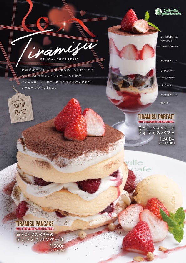 belle-ville pancake cafe国内全店舗で『苺とミックスベリーのティラミスパンケーキ』『苺とミックスベリーのティラミスパフェ』を1月16日(月)より期間限定で販売いたします。