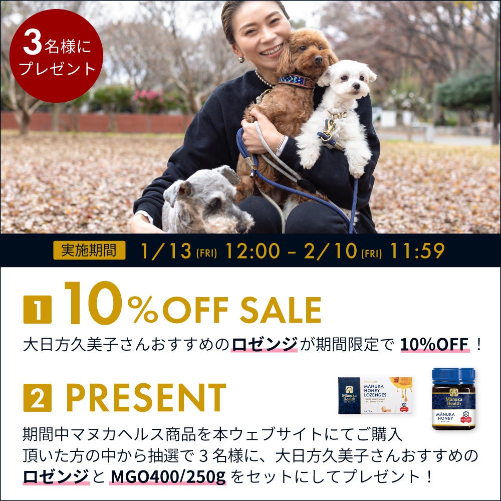 マヌカヘルスの中でも持ち運び便利なタブレットタイプ「ロゼンジ」好きを公言している大日方久美子さんにちなみ、期間限定で「ロゼンジ」10%割引キャンペーンを実施いたします。さらに、対象期間中にマヌカヘルスブランドサイトで購入頂いた方の中から抽選で3名様に、「ロゼンジ」とベストセラーはちみつの「マヌカハニーMGO400+/UMF13+(250g)」を各1個(計2個セット)プレゼントいたします。
