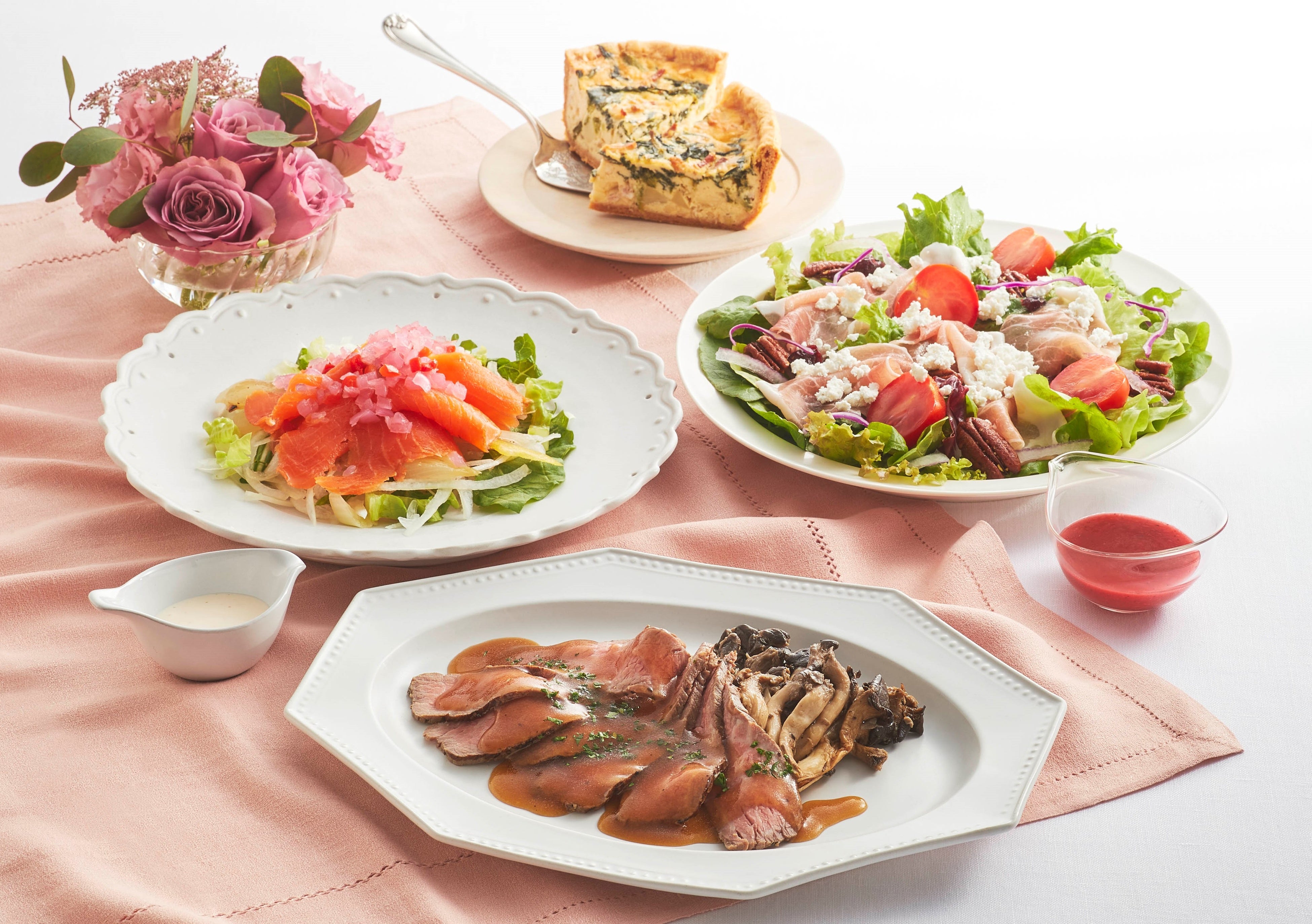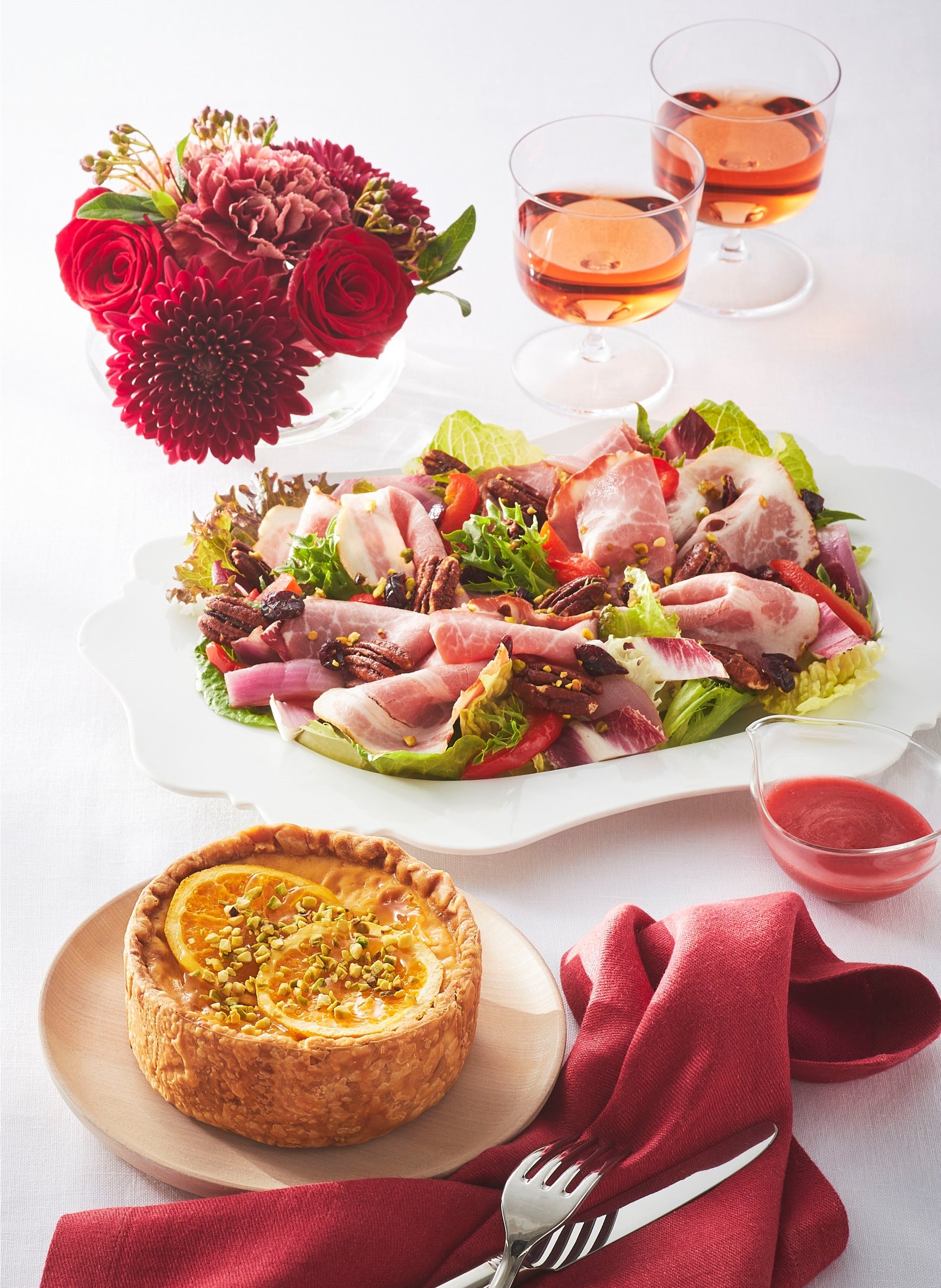 テーブルを華やかに彩る、サラダとキッシュの組み合わせ。週末のちょっと特別なメニューや、日ごろのご褒美も兼ねたバレンタインイベントのメニューとして、手軽にお楽しみいただけます。