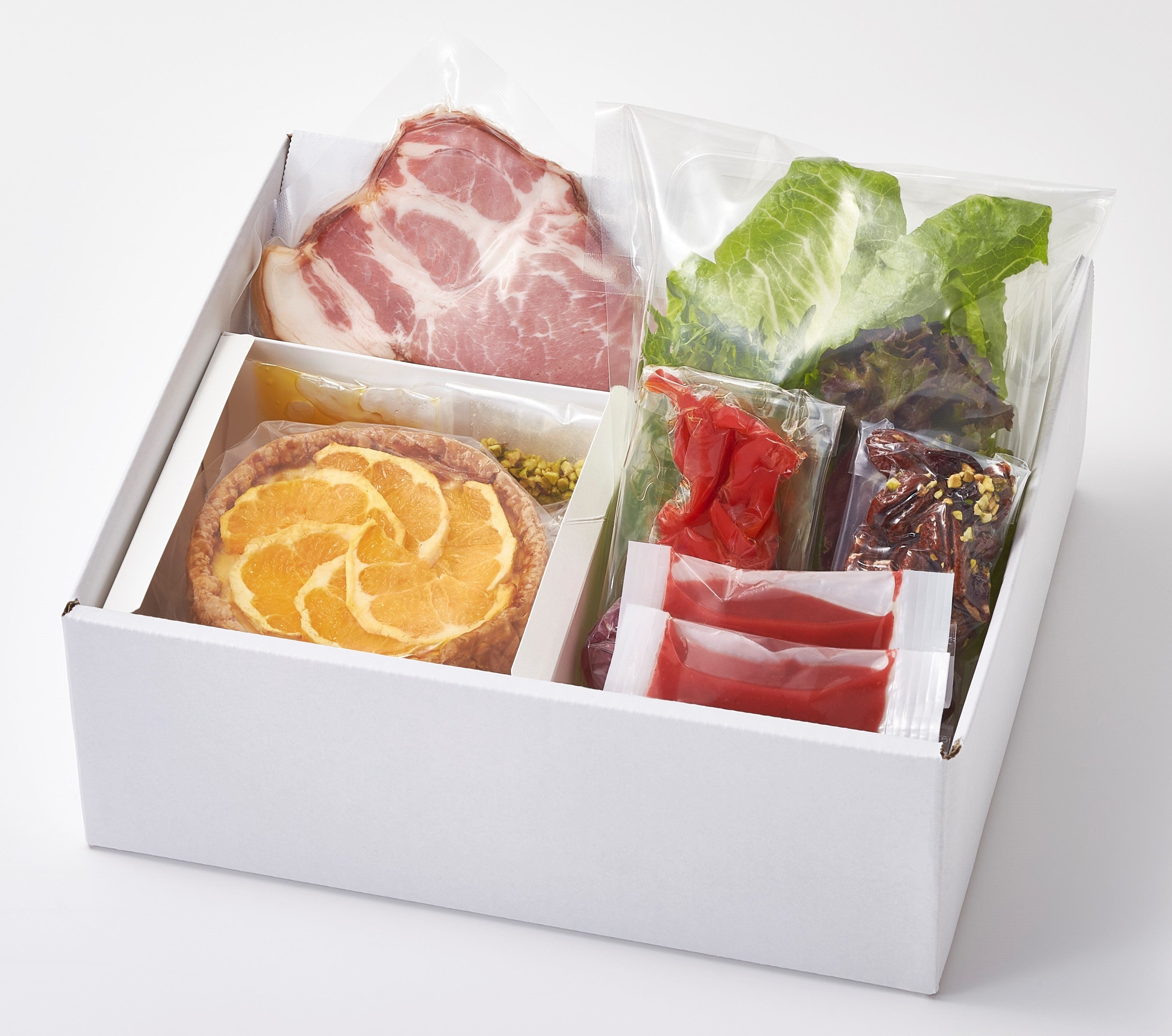 RF1で人気の牛肉グリルやサラダ、キッシュの詰め合わせ。期間限定の「カカオ&ナッツ香る 北海道産生ハムとトマトのサラダ」も入ったセットです。