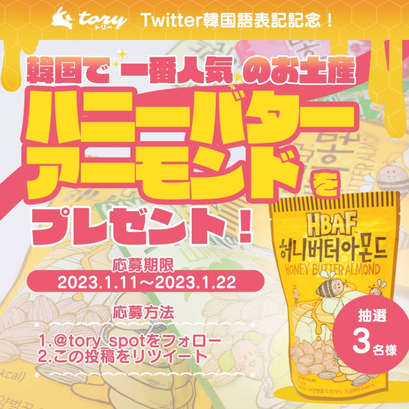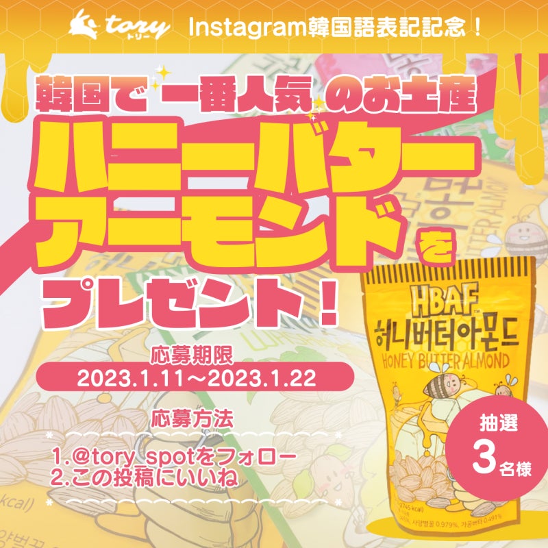 この度、韓国語表記を記念して、韓国の人気No.1お土産「ハニーバターアーモンド」をプレゼントするキャンペーンを開始しました。