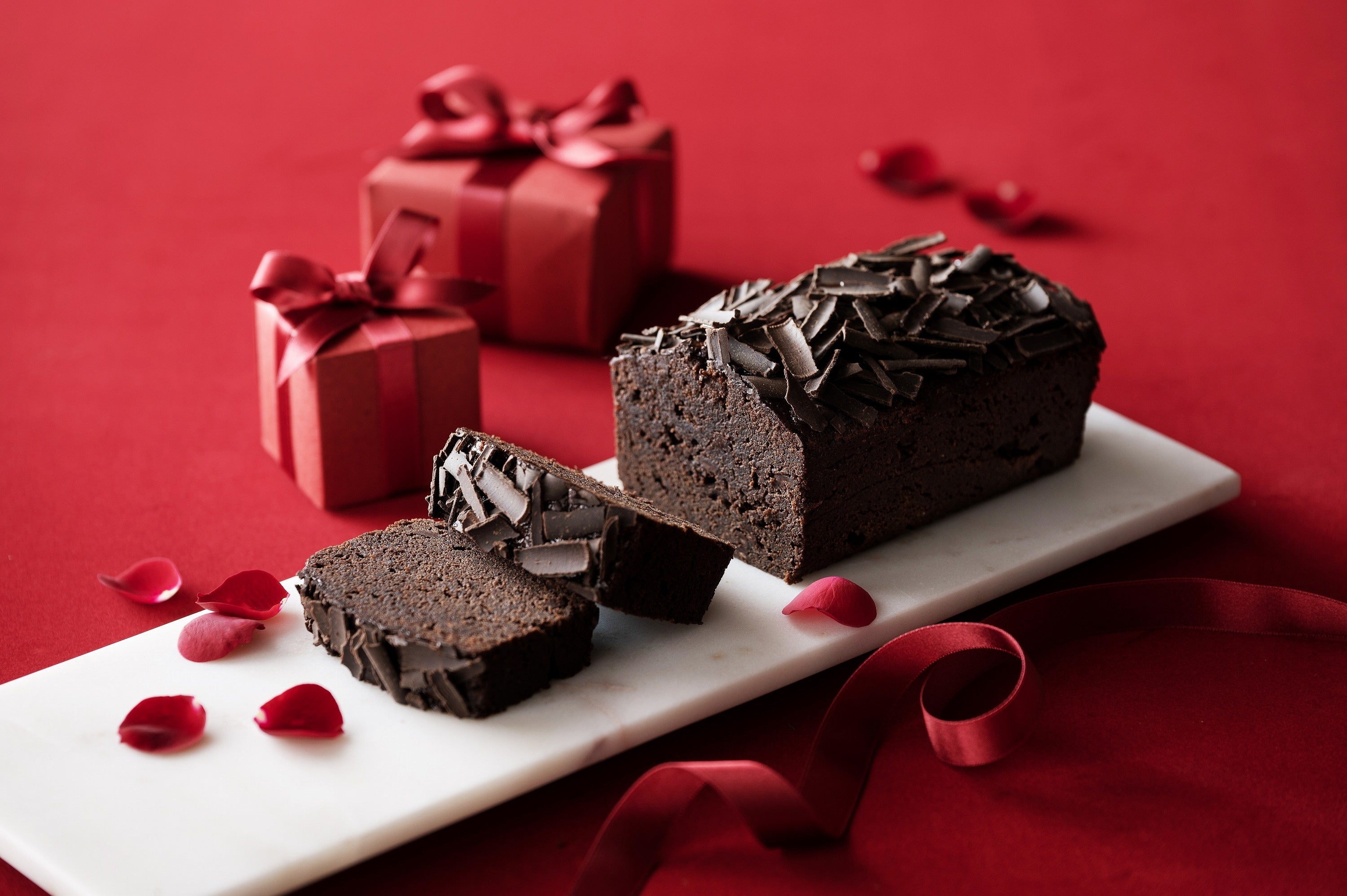 ベルギー産チョコレートチップ、ダークチョコレート、洋酒を練り込んだ生地を焼き上げ、薄くスライスしたベルギー産シェイブチョコレートをちりばめたパウンドケーキです。(化粧箱入り、アルコール製剤を添付)