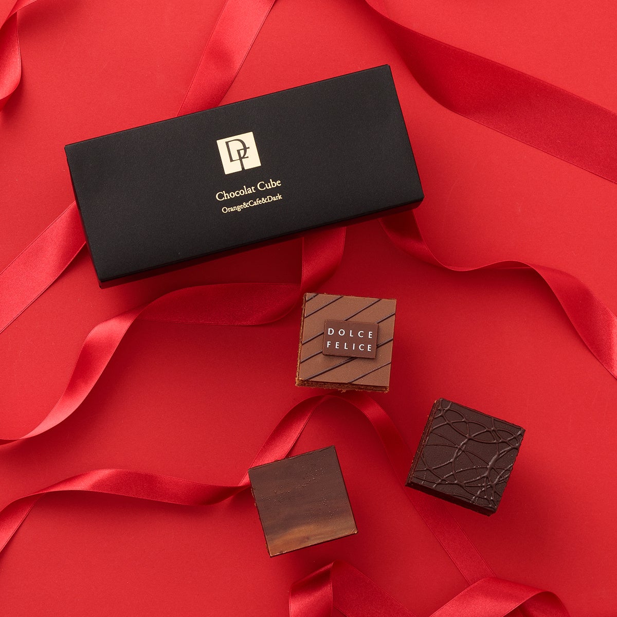 カカオ56%のガナッシュをサンドした濃厚チョコレートケーキ。 スタイリッシュなキューブ型で3種類の味を楽しめます。