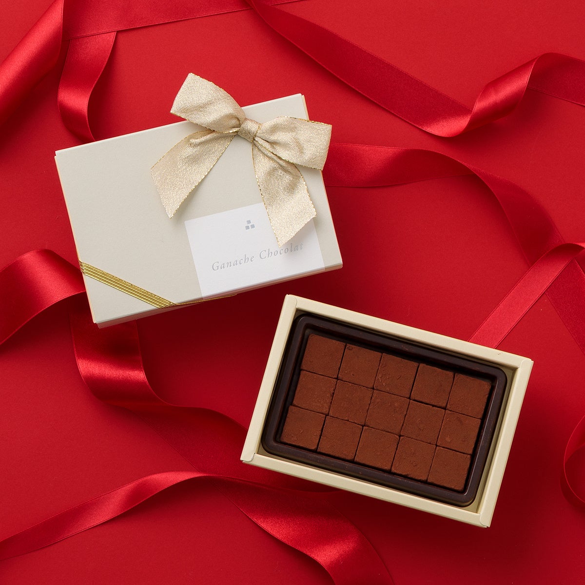芳醇な味わいのブランデーV.S.O.Pと2種類のチョコレートを使用。大人な風味となめらかなくちどけが特徴的な本格生チョコです。大きなリボンが華やかな本商品は、2023年の数量限定商品です。
