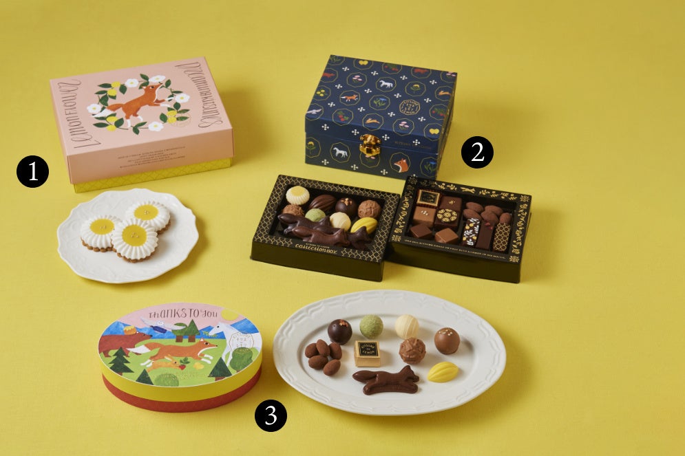「キツネとレモン」①夢見るキツネのレモンフラワー(6個入)1,404円②コレクションボックス(25個入)2,916円③サンクストゥ―ユーの旅(13個入)1,080円