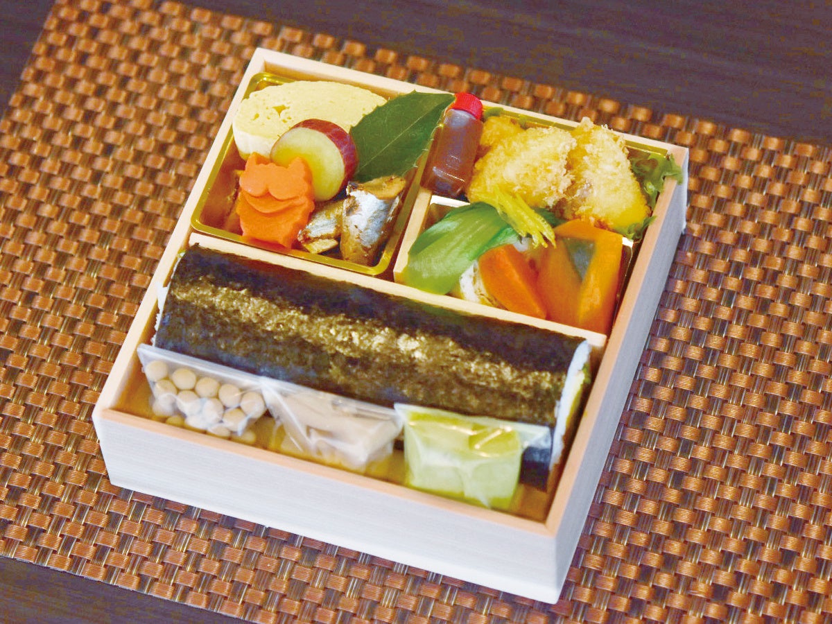 鰯の梅煮をはじめ、福(ふぐ)カツ・鬼面人参・福豆など、節分料理を彩りよく詰めたお弁当。