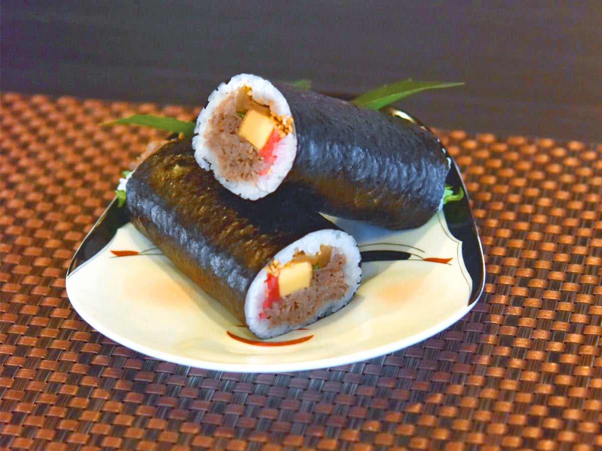 滋味深い黒毛和牛をたっぷり使い、レタス・紅しょうが・胡麻などと合わせた贅沢な恵方巻き。