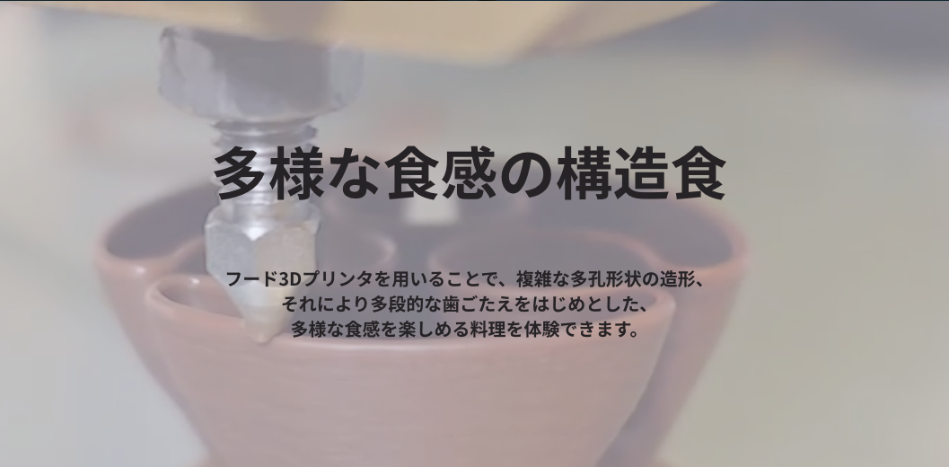デジタル技術を用いた食づくりで、時間や場所の制限を超えた食体験の実現し、「いつでも・どこでも・だれでも食を楽しめる社会づくり」を目指す。主にデジタルデータを元に食品を出力する機械、3Dフードプリンタを組み合わせることで、食のパーソナライズや、食感のデザインなど、これまでにない食体験の実現を開拓していく。