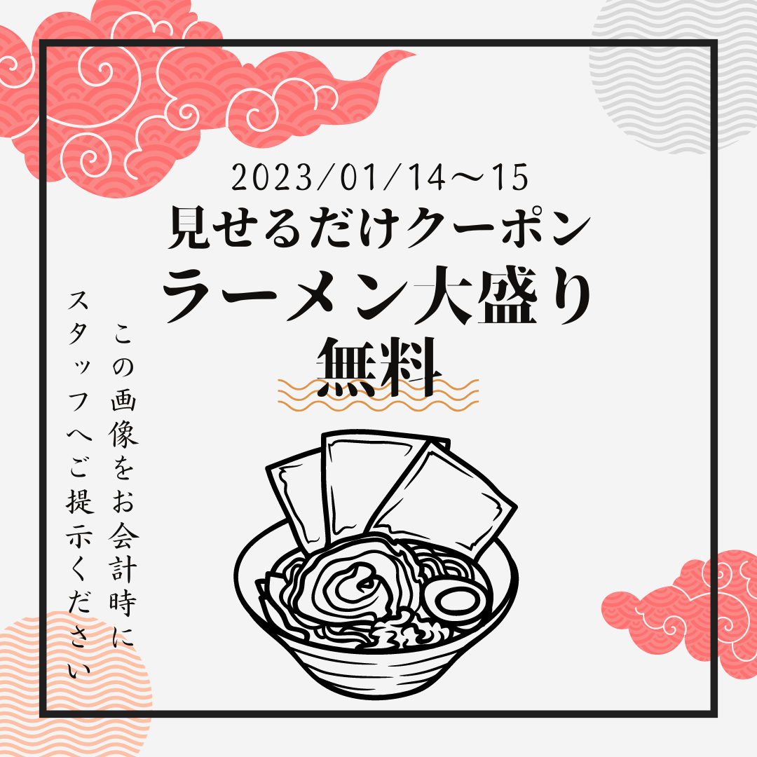 お好みのラーメンを大盛り無料で楽しめます!この機会にぜひご来店ください。