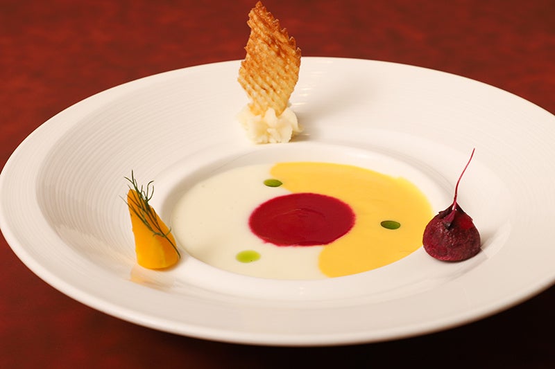 島にんじん、ビーツ、ポテトを使用した3種のスープ。島にんじんとポテトは素材の味を活かし、ビーツはスパイシーに仕上げました。