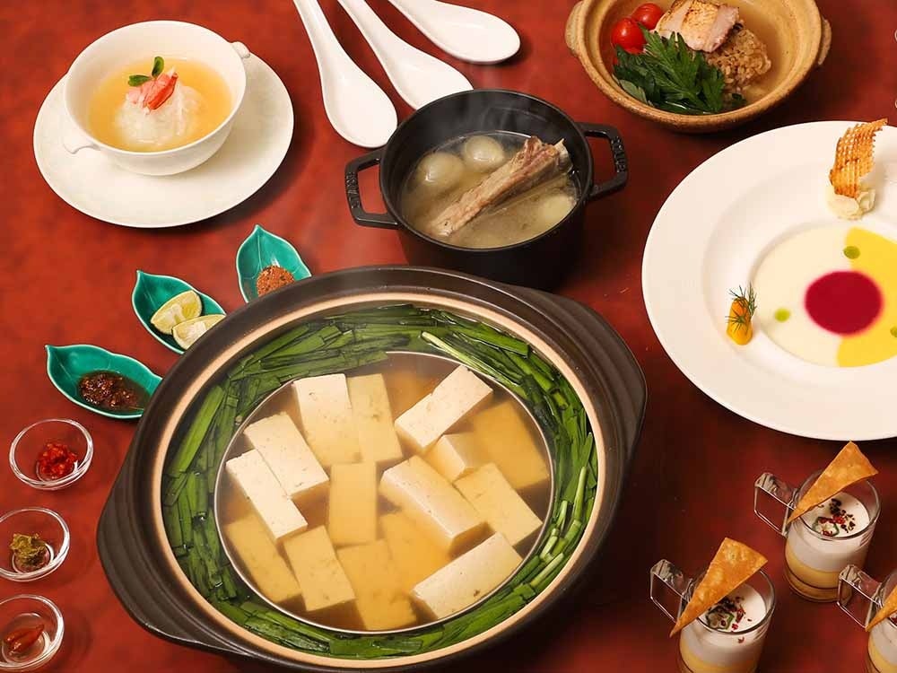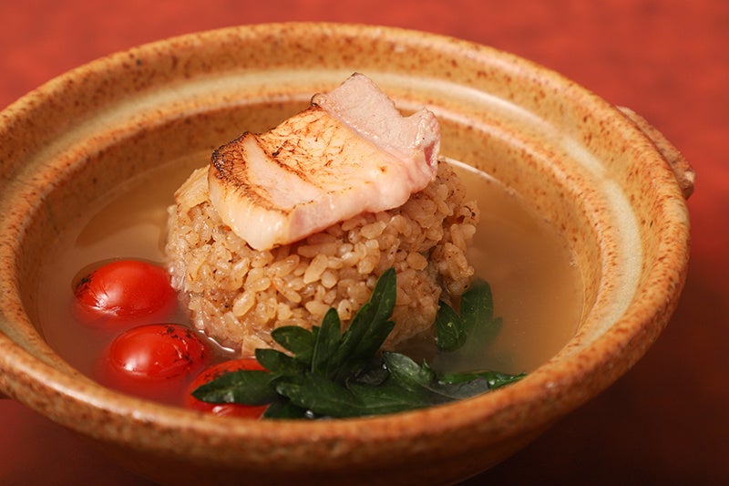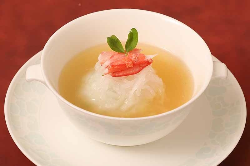 若鶏と豚もも肉を6時間蒸し、旨味が凝縮した澄みきったスープに白身魚、アオサ、ズワイ蟹の手毬団子を浮かべた、贅沢な味わいの一品です。