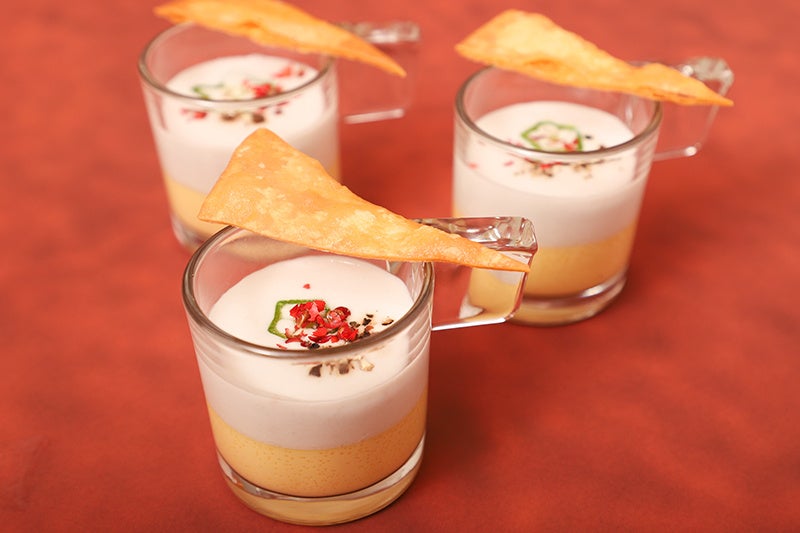 田芋は、沖縄で栽培されている里芋の一種です。田芋の茶わん蒸しと田芋のスープが二層になっています。