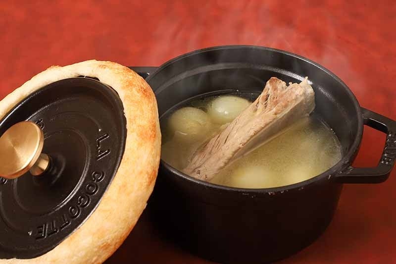 スペアリブと玉ねぎをとろ火で2時間炊き、旨味のあるスープに仕立てました。パン生地で器を密封し、熱々で提供いたします。パン生地もスープとともにお召し上がりください。