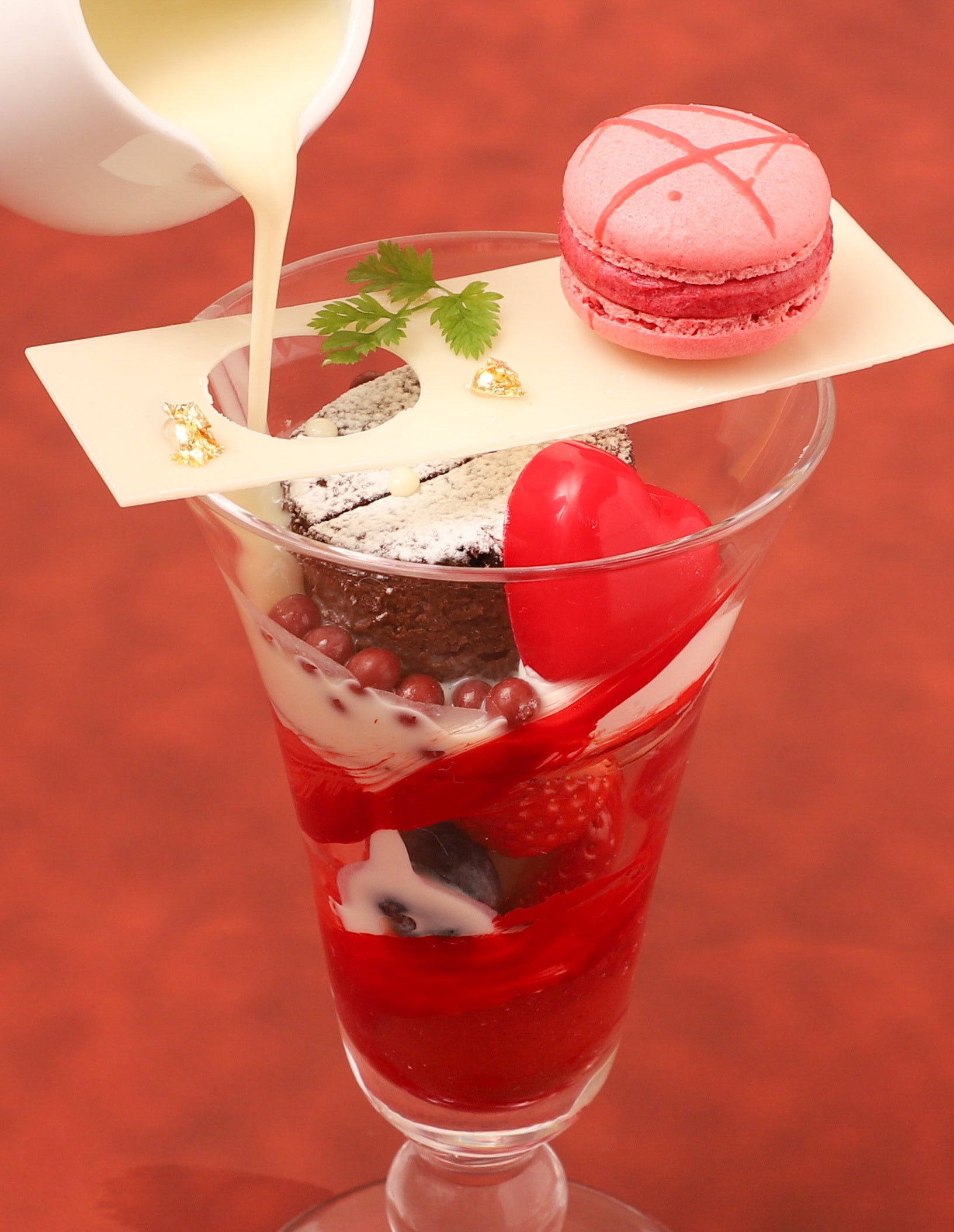 スフレショコラと冷たい赤い果実のスープを入れたグラスの中に、温かいホワイトチョコレートのスープを注ぐ、ダブルスープで楽しむスイーツです。