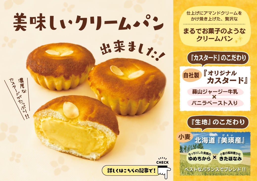 北海道産小麦を使用した生地に蒜山ジャージー牛乳とバニラペースト入りカスタードをたっぷり包んだクリームパンです。
