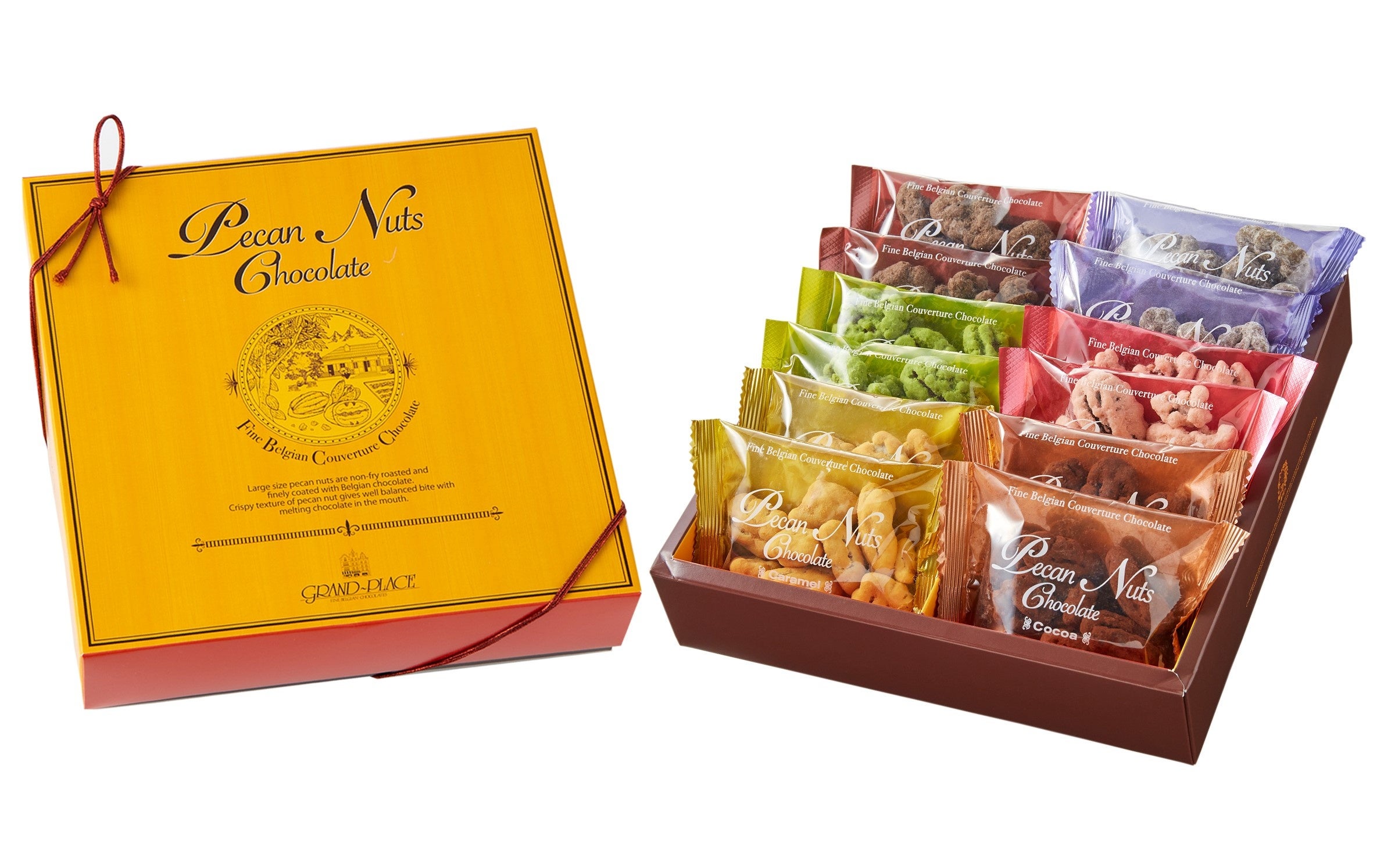 グランプラスの大人気商品! 大粒のペカンナッツを、油を使わずにそのままローストしベルギー産クーベルチュールで丁寧に包み込みました。