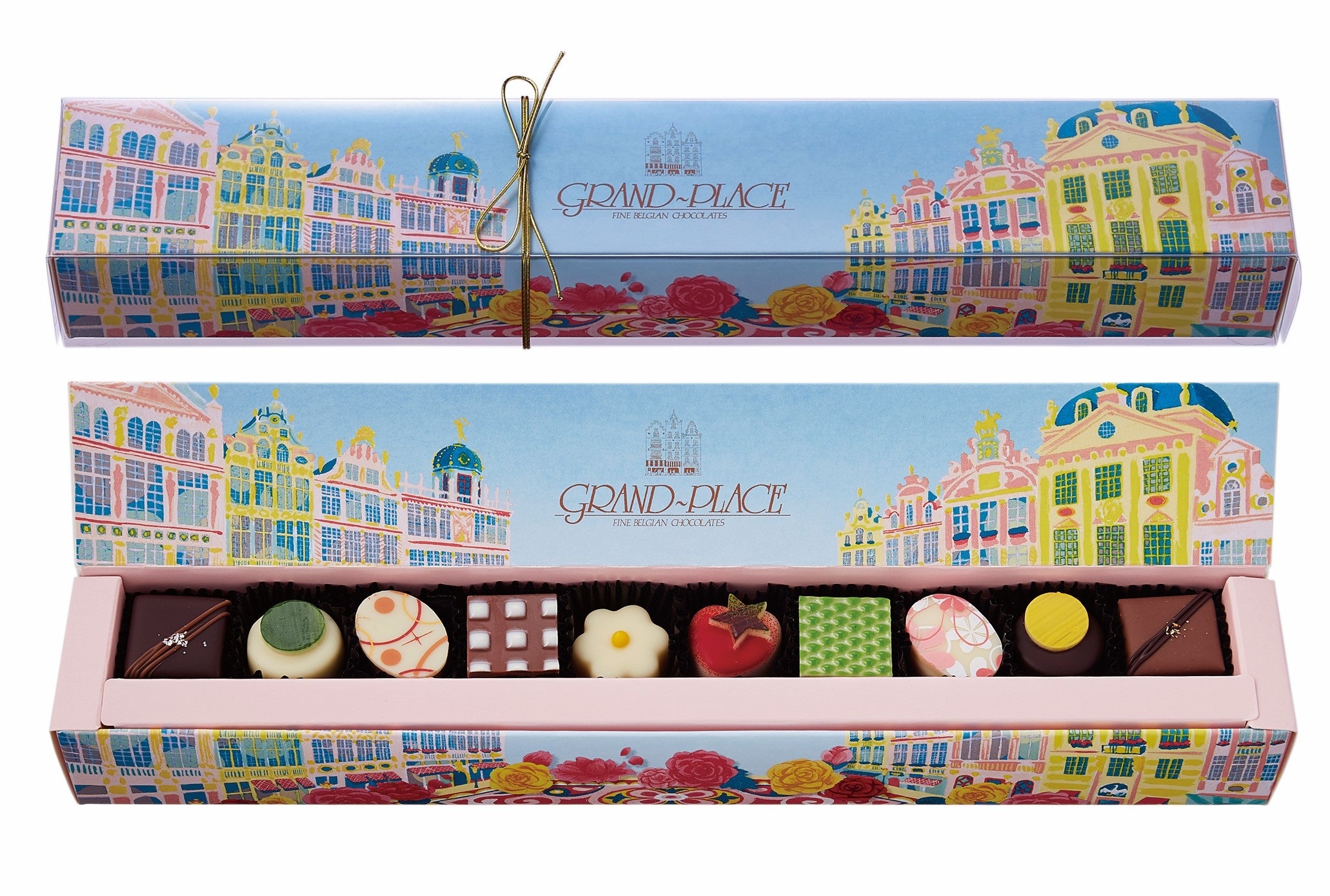パッケージは、ベルギー ブリュッセルのグランプラス広場の華やかなフラワーカーペットをイメージ。キュートなショコラに花を添えます。