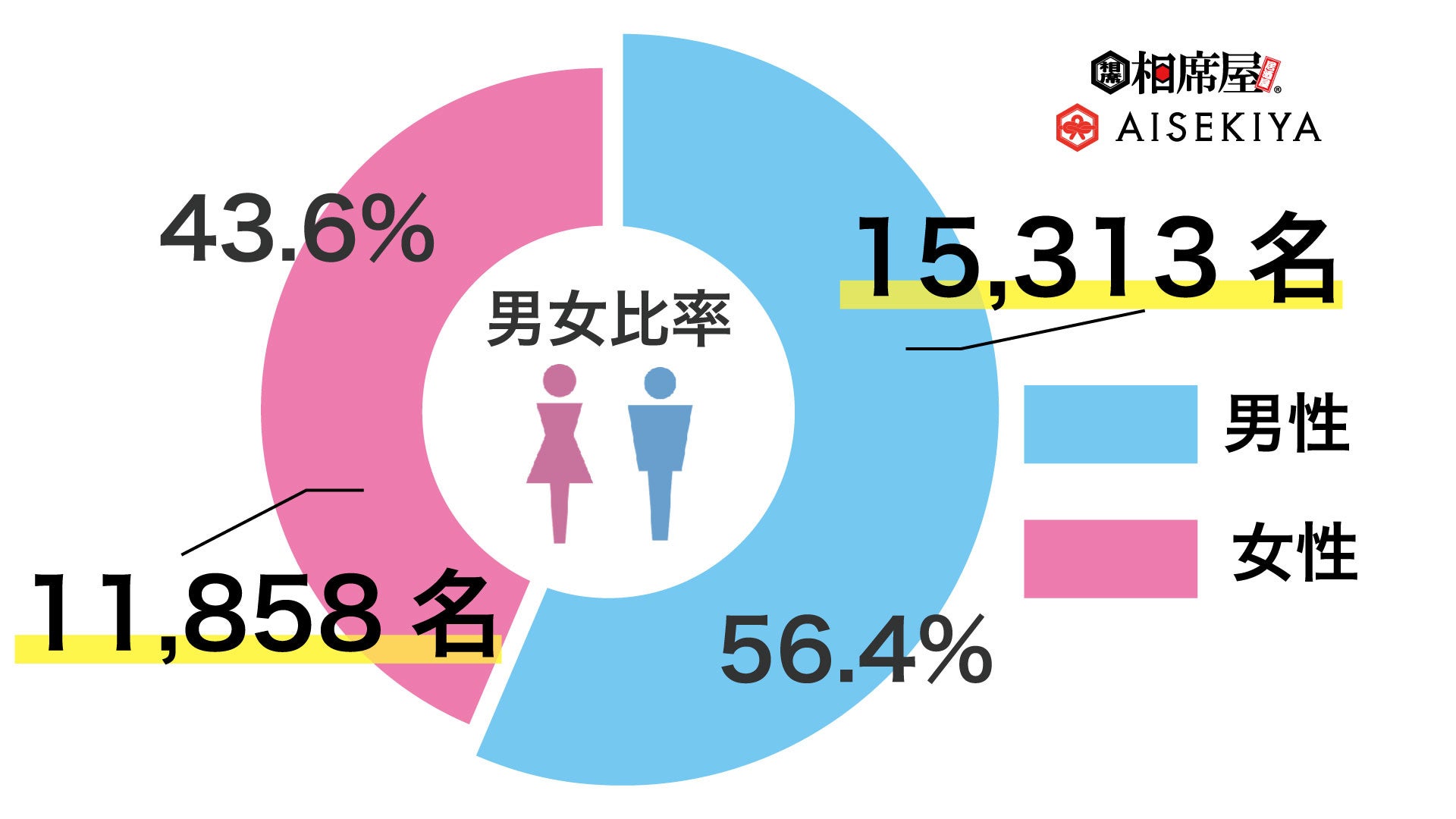 2022年12月の相席屋への男性来店数は15,313人、女性来店数は11,858人を突破。男性56.4%、女性43.6%でした。また、男性来店数のうち初めて来店した男性は4,571人、2回以上来店した男性は10,742人、女性来店数のうち初めて来店した女性は3,564人、2回以上来店した女性は8,294人でした。また、20代の来店数に絞ってみると、男性来店数70.6%、女性来店数77.6%でした。