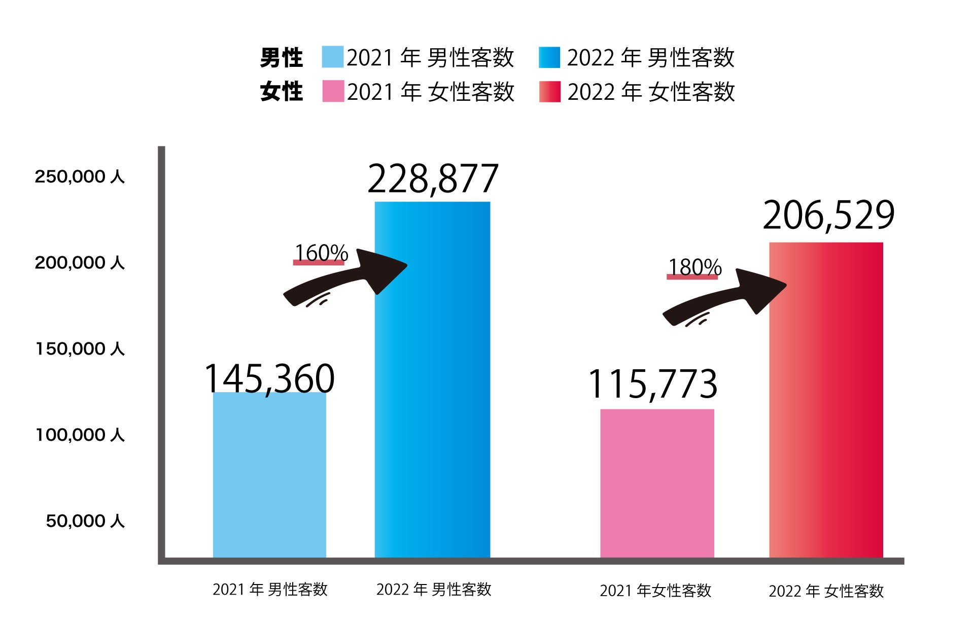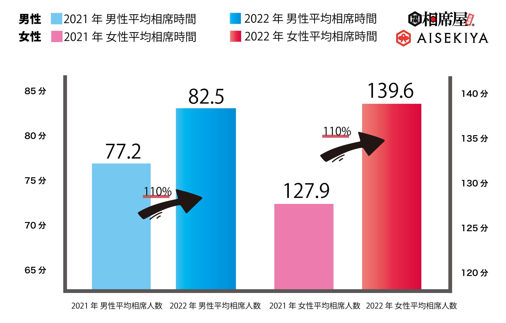 2022年度の総相席回数は2021年度比約180%の190,736回、2022年度の総男性来店数は2021年度比約160%の228,877人、総女性来店数は2021年度比約180%の206,529人を突破。平均男性相席時間は2021年度比約110%の82.5分、平均女性相席時間は2021年度比約110%の139.6分となりました。