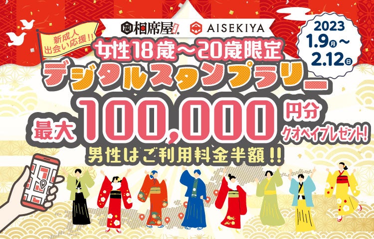 2023年1月9日〜2月12日まで、2023年に成人する18歳〜20歳を対象に相席屋/AISEKIYAにて新成人イベントを開催しております。(2002年4月2日〜2005年4月1日生まれの方)男性は1名様あたりのお会計が半額(割引上限5000円まで)、女性は最大100,000円分のQUOカードPAYをゲットできるチャンスとなっております。