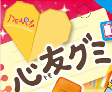 商品特徴:ジュレ入りピーチ&グレープ味と「友」型レモン&オレンジ味の2種ミックス。