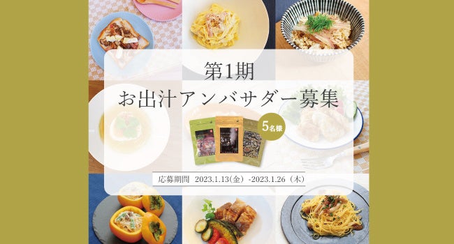 募集期間は2023年1月13日(金)~1月26日(木)の14日間。アンバサダーに就任された方には、竈出汁・野菜出汁・きのこ出汁の3種類のお出汁パックをプレゼントいたします。