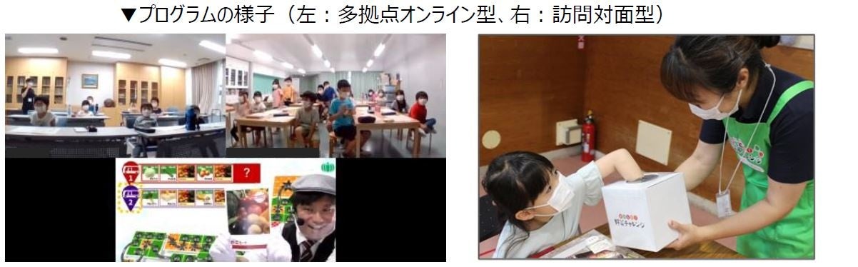 - 【 多拠点オンライン型 】 日本全国野菜すごろくの旅編:日本全国を舞台にした「野菜すごろく」の中で、野菜のクイズや体験活動ができるオンラインプログラムです。全国の放課後活動をオンラインでつなぐ取り組みです。遠隔地に住む子ども同士が野菜を通じて交流を深め、自分や相手の住む地域の野菜や料理を知ることでより野菜に興味を持つことを目指しています。