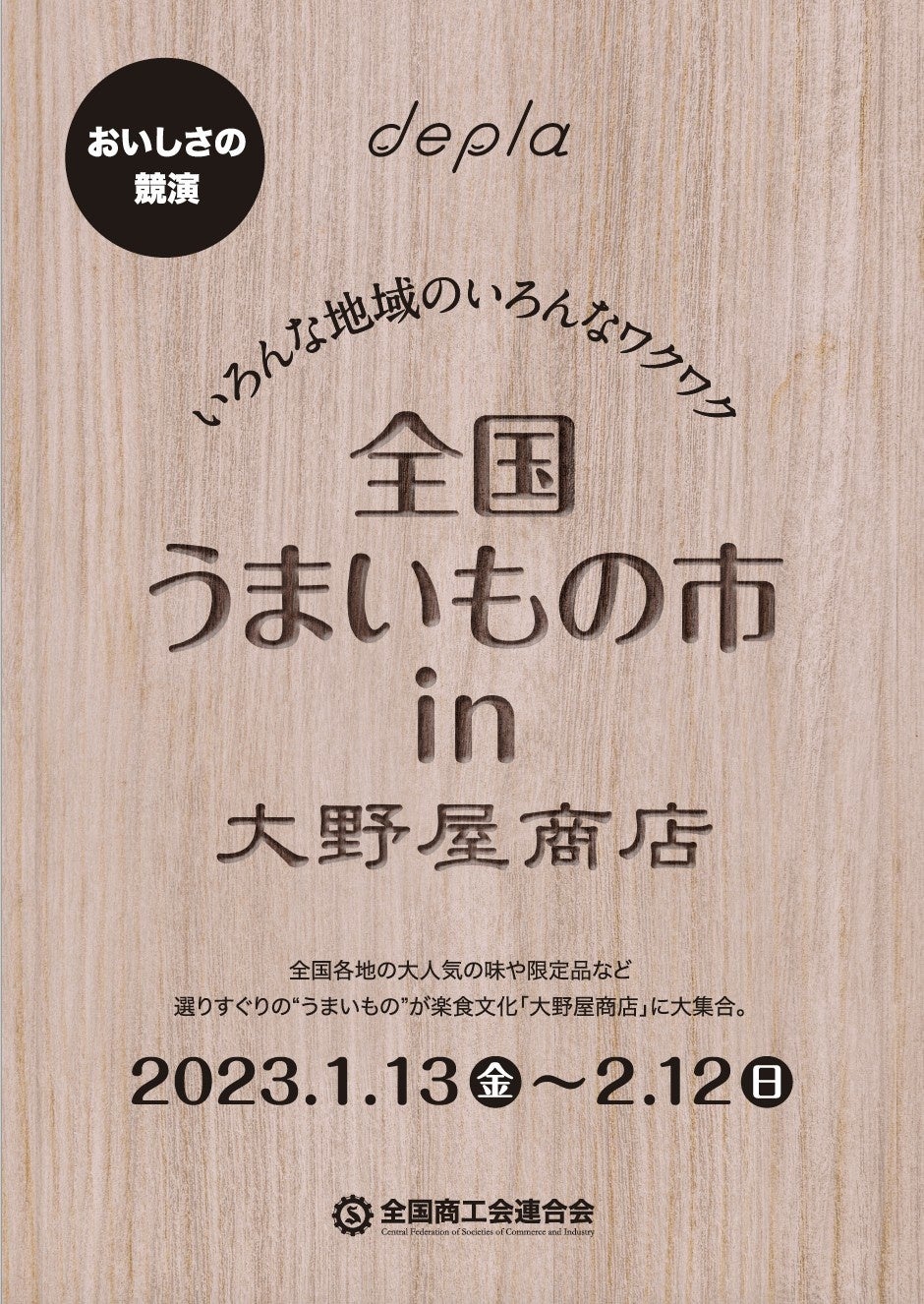 全国商工会連合会(所在地:東京都千代田区、会長:森 義久)主催で2023年1月13日(金)~2月12日(日)まで”全国うまいもの市”を大野屋商店にて開催しております。※実施店舗は開催概要をご覧ください。