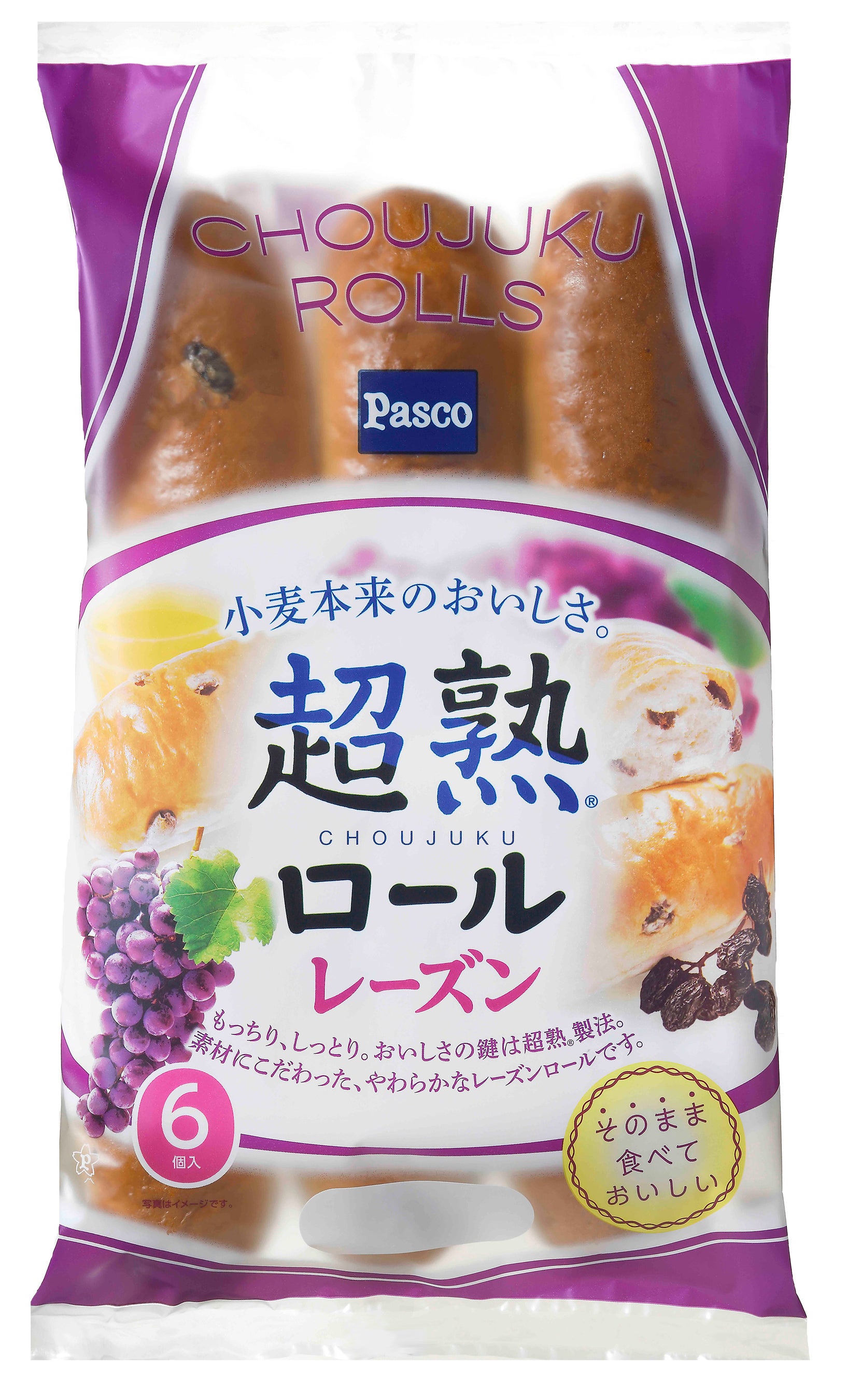 しっとり、さらっとした口どけの超熟ロールに、洋酒漬けのレーズンを入れた、そのままでもおいしくお召し上がりいただけるロールパンです。