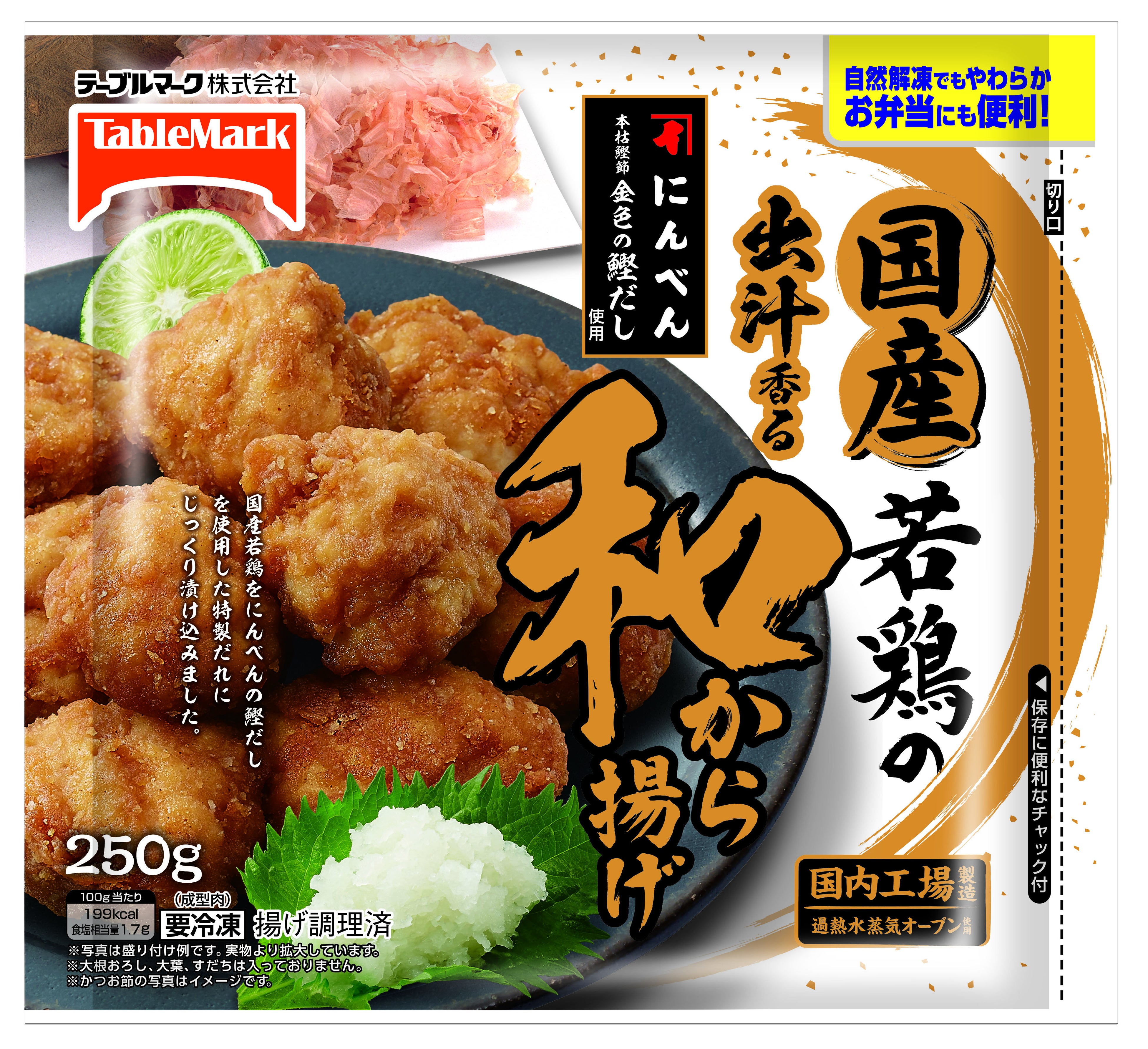 国産若鶏のむね肉に、こだわりのだしを効かせた和風から揚げです。本枯鰹節を使用したにんべん”「金色の鰹だし」を使った特製だれに漬け込み、シンプルな旨さに。食卓のおかずに、おつまみに、お弁当に大活躍の一品です。