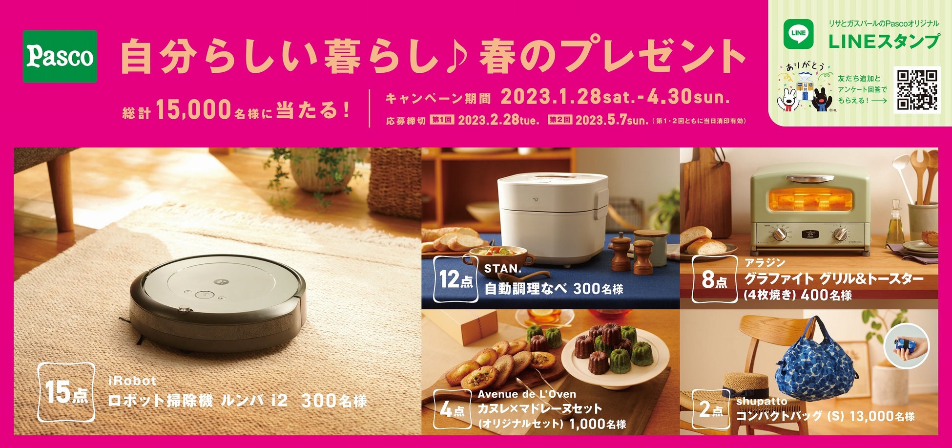 今回のキャンペーンでは「自分らしい暮らし♪春のプレゼント」と題し、生活に寄り添い暮らしの手助けをしてくれる、iRobotのロボット掃除機「ルンバ」をはじめ、シンプルで使いやすい自動調理なべ等、5つの賞品コースからお好きなコースをお選びいただき、抽選で総計15,000名様にプレゼントいたします。