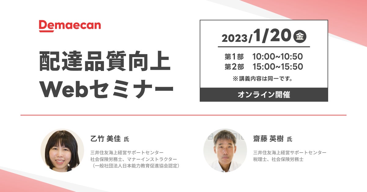 株式会社出前館(本社:東京都渋谷区、代表取締役社長:藤井英雄)が運営する日本最大級のデリバリーサービス『出前館』は、お客さま対応などの豊富な経験を有する、三井住友海上経営サポートセンターの乙竹美佳氏、齋藤英樹氏を講師に招き、『出前館』の配達員を対象とした「第1印象で差をつける!配達品質向上に役立つ接遇 Web セミナー」を 2023年1月20日(金)に実施いたします。