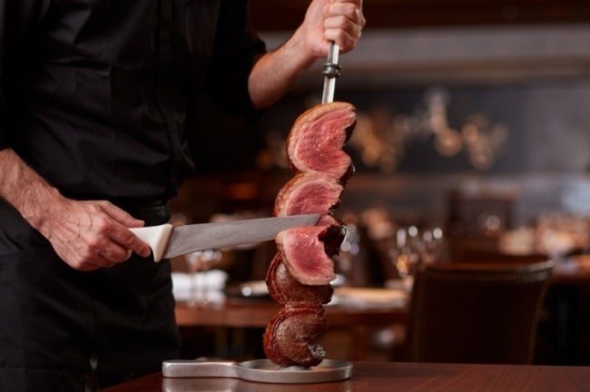 シュラスコとは、ブラジリアンバーベキューのことです。塊のまま串に刺し岩塩のみで焼き上げたジューシーなお肉を、「パサドール」と呼ばれるスタッフがそのままの状態でテーブルまでお持ちし、お客様の目の前でお好きな部分をお好きなだけ切り分けてご提供するスタイルのバーベキューです。岩塩のみのシンプルな味付けで、油を一切使わずに焼き上げる為、肉の余分な脂も落ちてとてもヘルシーです。