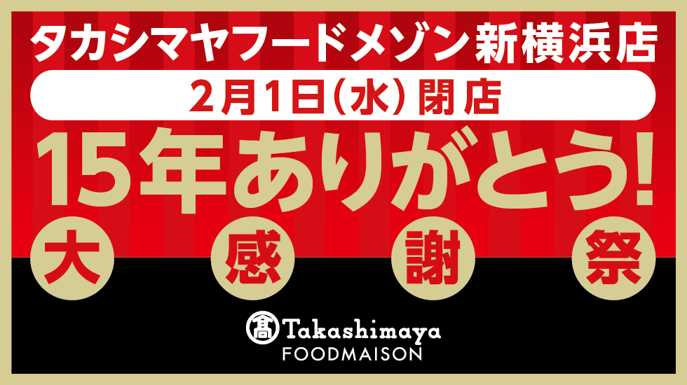 タカシマヤフードメゾン新横浜店は、2008年3月に「駅上のデパ地下」としてオープンして以来、約15年間に渡り、地元のお客様を中心にご愛顧いただいてまいりましたが、2月1日(水)をもって営業を終了します。そこでタカシマヤフードメゾン新横浜店では、これまでのご愛顧に感謝をして1月18日(水)から営業終了となる2月1日(水)までの期間、「15年ありがとう!大感謝祭」を開催します。各ブランドから定番の商品を特別価格でご提供するほか、人気商品を詰め込んだお得なお楽しみ袋「感謝袋」もご用意します。