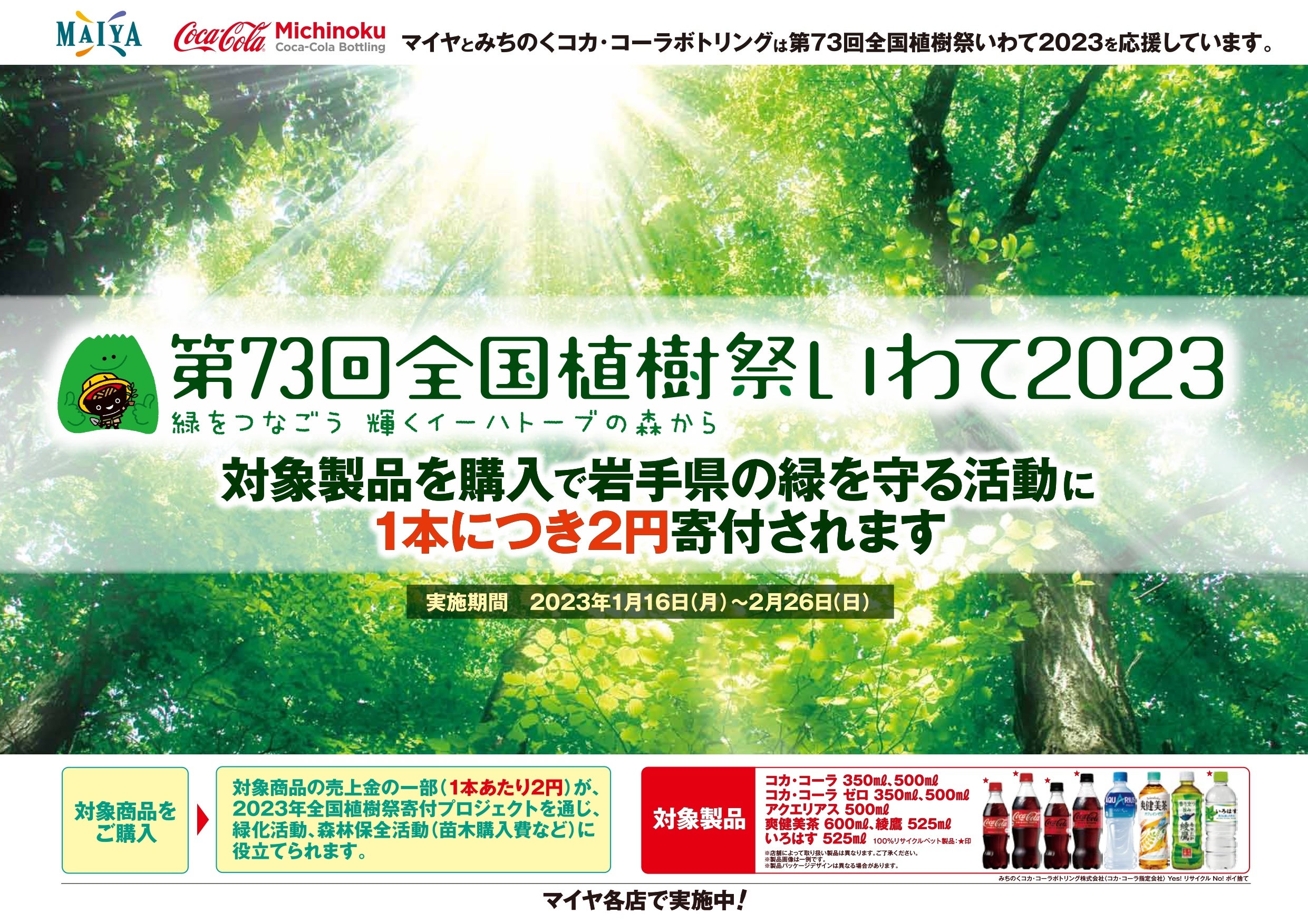 みちのくコカ・コーラボトリング株式会社(本社: 岩手県盛岡市、代表取締役社長: 谷村広和)は、株式会社マイヤ(代表取締役社長: 伊原良幸)と協働し、対象製品の売上の一部を岩手県の緑を守る活動に寄付するプロジェクトを、1月16日(月)からマイヤ各店の店頭キャンペーンとして実施いたします。