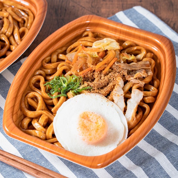 【特長】資さんうどん監修による「焼きうどん」です。やわらかな食感のうどん麺と、甘みと酸味のバランスが絶妙なオリジナルソースと絡めています。削り節の香りが引き立ち、野菜炒め・ネギのほか、目玉焼き風オムレツで味の変化も楽しめます。