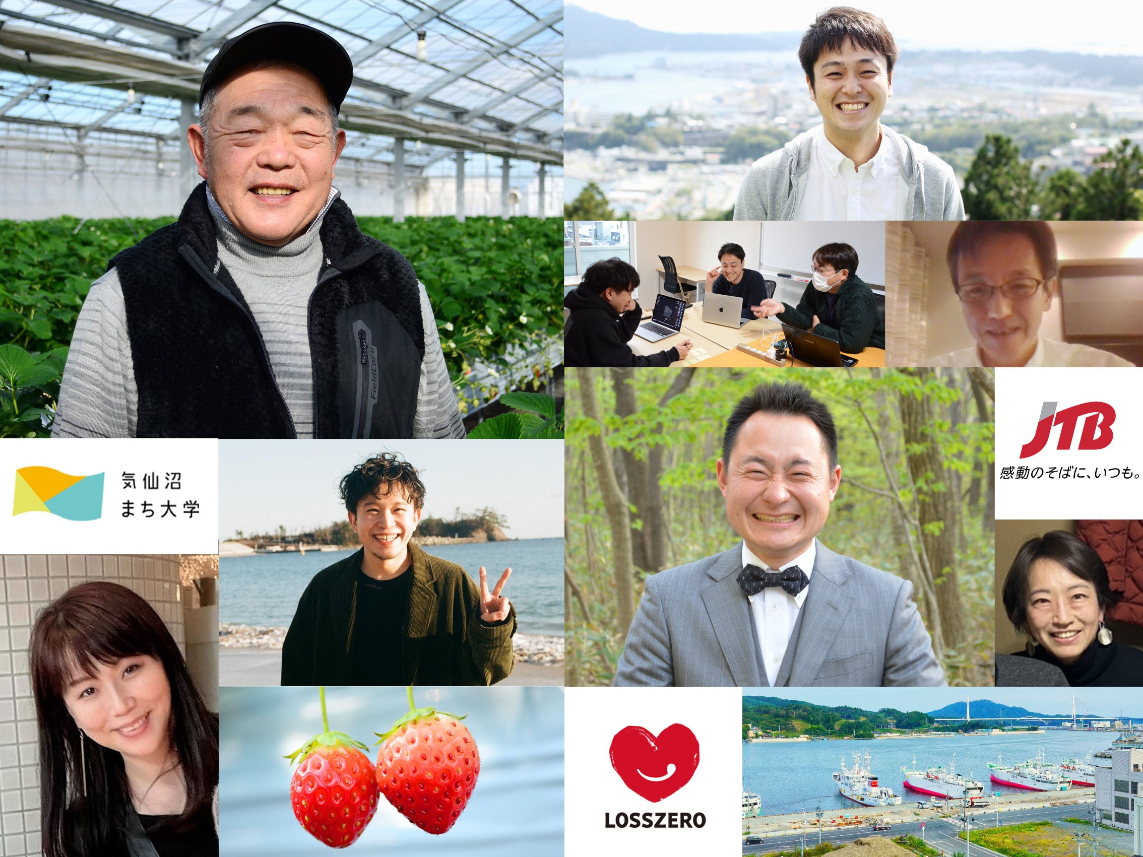当商品はいちご農家シーサイドファーム波路上の佐藤代表(写真左上)、ロスゼロといちご農家の橋渡し役になった気仙沼まち大学運営協議会の成宮さん(中央右)、みなといちごのラベルデザインを担当した気仙沼出身・在住デザイナーの志田さん(中央左)他、多くの人の想いが重なって誕生しました。
